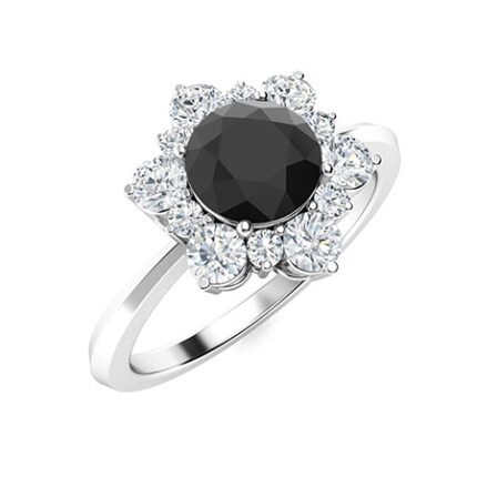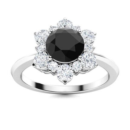 2.8 Ct Round Cut Onyx Black & White Diamond Floral Design Halo Knife Shaped Shank Wedding Engagement Ring in 925 Sterling Silver White Gold Finish