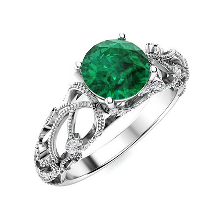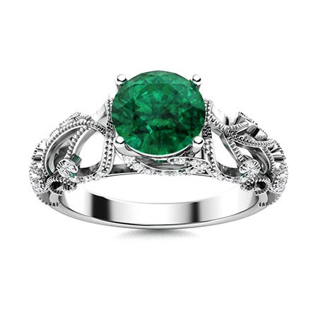 Vintage 2.5 Ct Round Cut Emerald Green Diamond Solitaire Filigree Milgrain Design Engagement Ring in 925 Sterling Silver White Gold Finish