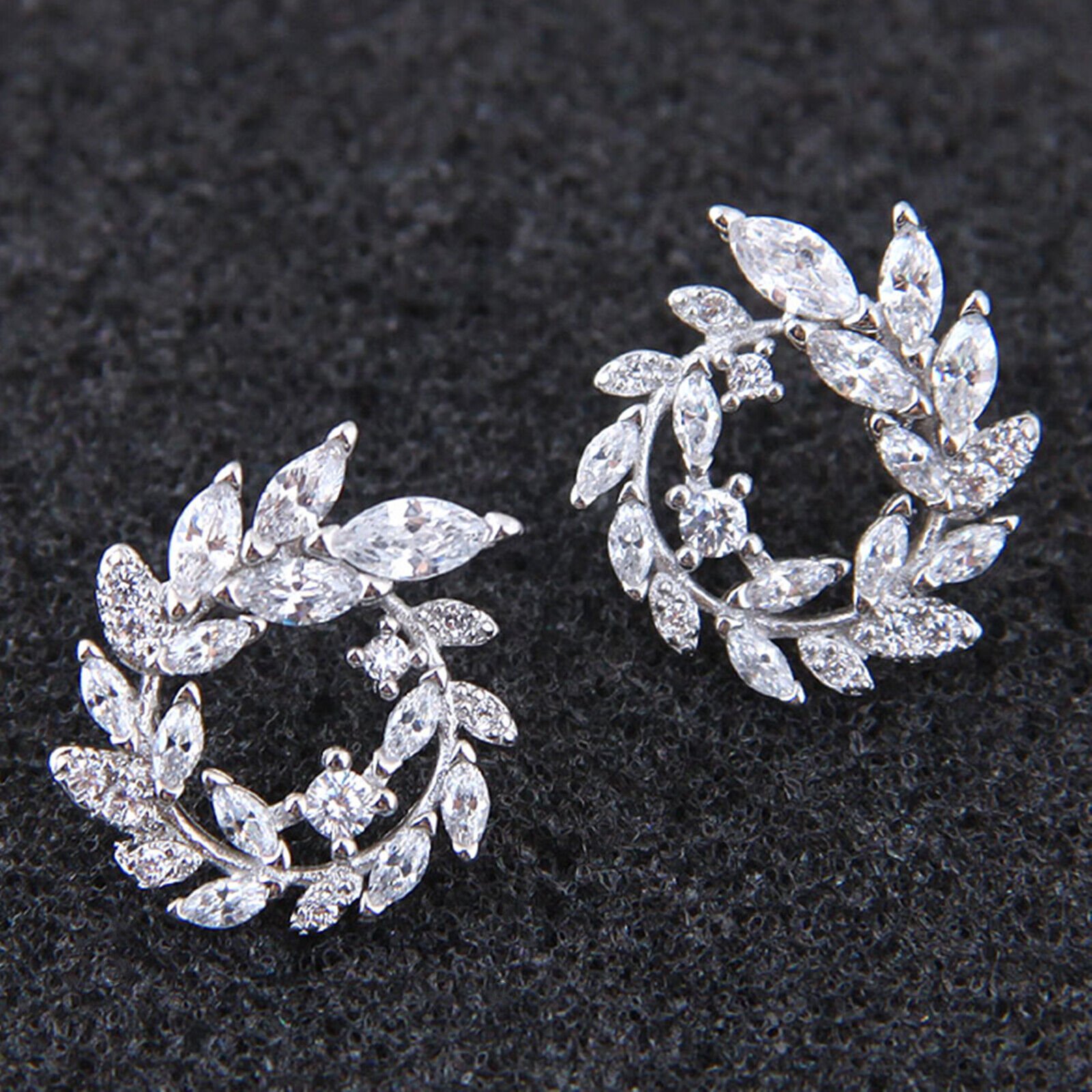 Solitaire Olive Branch Leaf Circle Stud Earrings