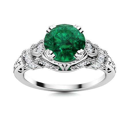Vintage 2.5 Ct Round Cut Emerald Green Diamond Solitaire Filigree Milgrain Design Engagement Ring in 925 Sterling Silver White Gold Finish