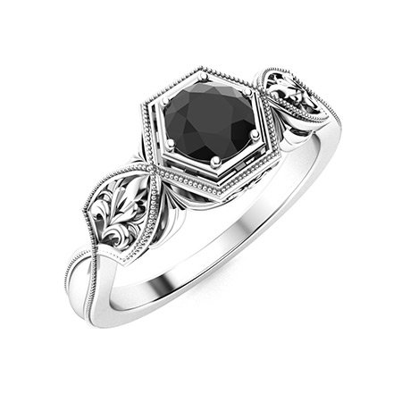Home Engagement Rings Vintage 2.5 Ct Round Cut Onyx Black Diamond Solitaire Floral Milgrain Hexagon Design Engagement Ring in 925 Sterling Silver White Gold Finish