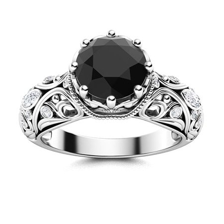 Home Engagement Rings Vintage 2.8 Ct Round Cut Onyx Black Diamond Solitaire Filigree Milgrain Design Engagement Ring in 925 Sterling Silver White Gold Finish